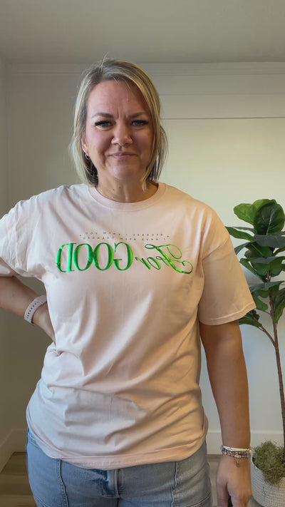 Celebrate friendship with this playful short-sleeve tee in a soft blush pink shade. Its eye-catching green metallic lettering reads "Because I knew you, I have been changed For Good," making it a charming reminder of meaningful connections. Perfect for adding a touch of warmth and whimsy to your everyday style.