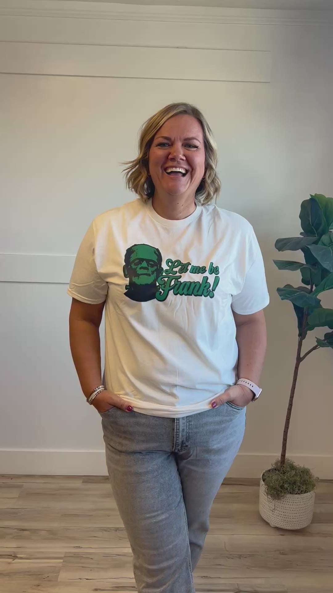 This playful cream tee features a bold green "Let me be Frank!" graphic paired with a fun Frankenstein design. Its short sleeves and casual fit make it perfect for adding a quirky touch to your everyday style.