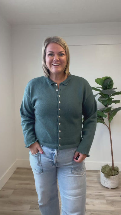Cozy up in the Kaylee Cardigan, a playful twist on classic comfort. This hunter green sweater features a relaxed drop shoulder and delicate tiny ruffles on the round collar and cuffs for a touch of charm. Button up for warmth or leave it open for a breezy vibe. The soft fabric and straight hem make it perfect for layering or wearing solo.